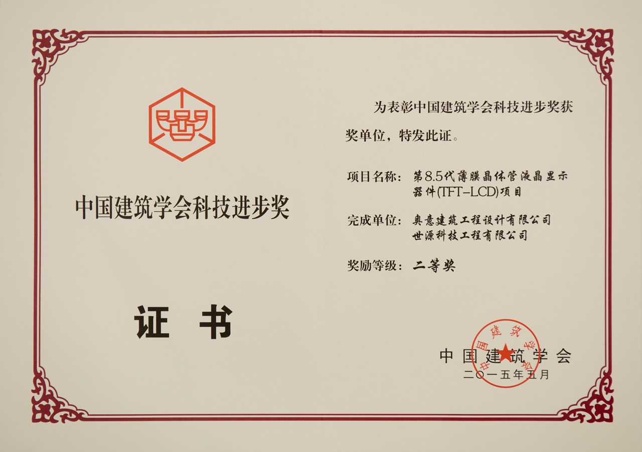 • 深圳市華星光電技術有限公司第 8.5 代薄膜晶體管液晶顯示器件項目 中國建筑學會科技進步二等獎-2015