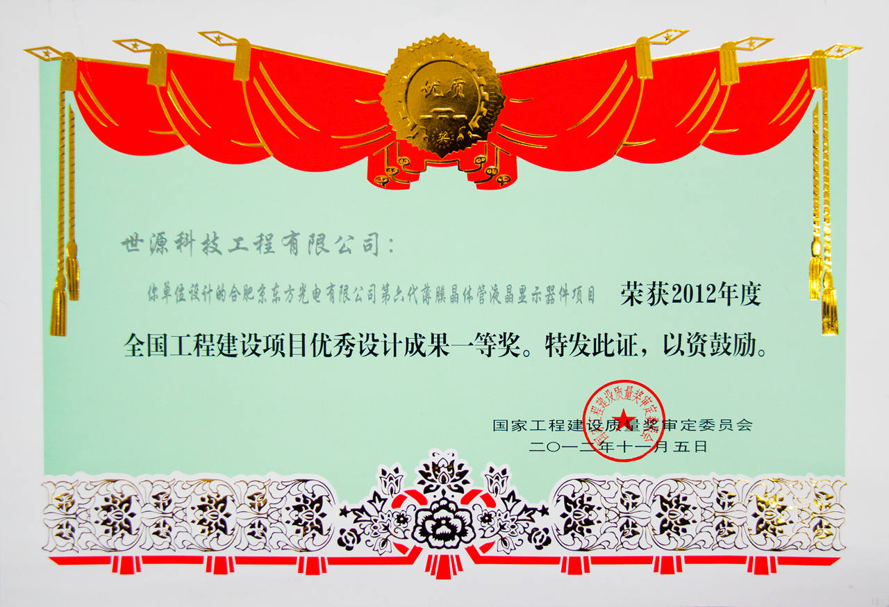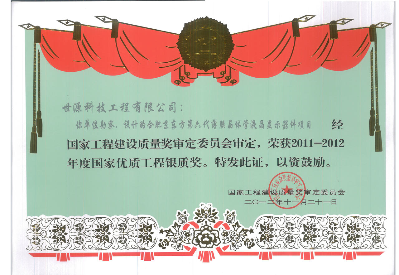 • 國家優質工程銀質獎合肥京東方光電科技有限公司第6代薄膜晶體管液晶顯示器項目-2012