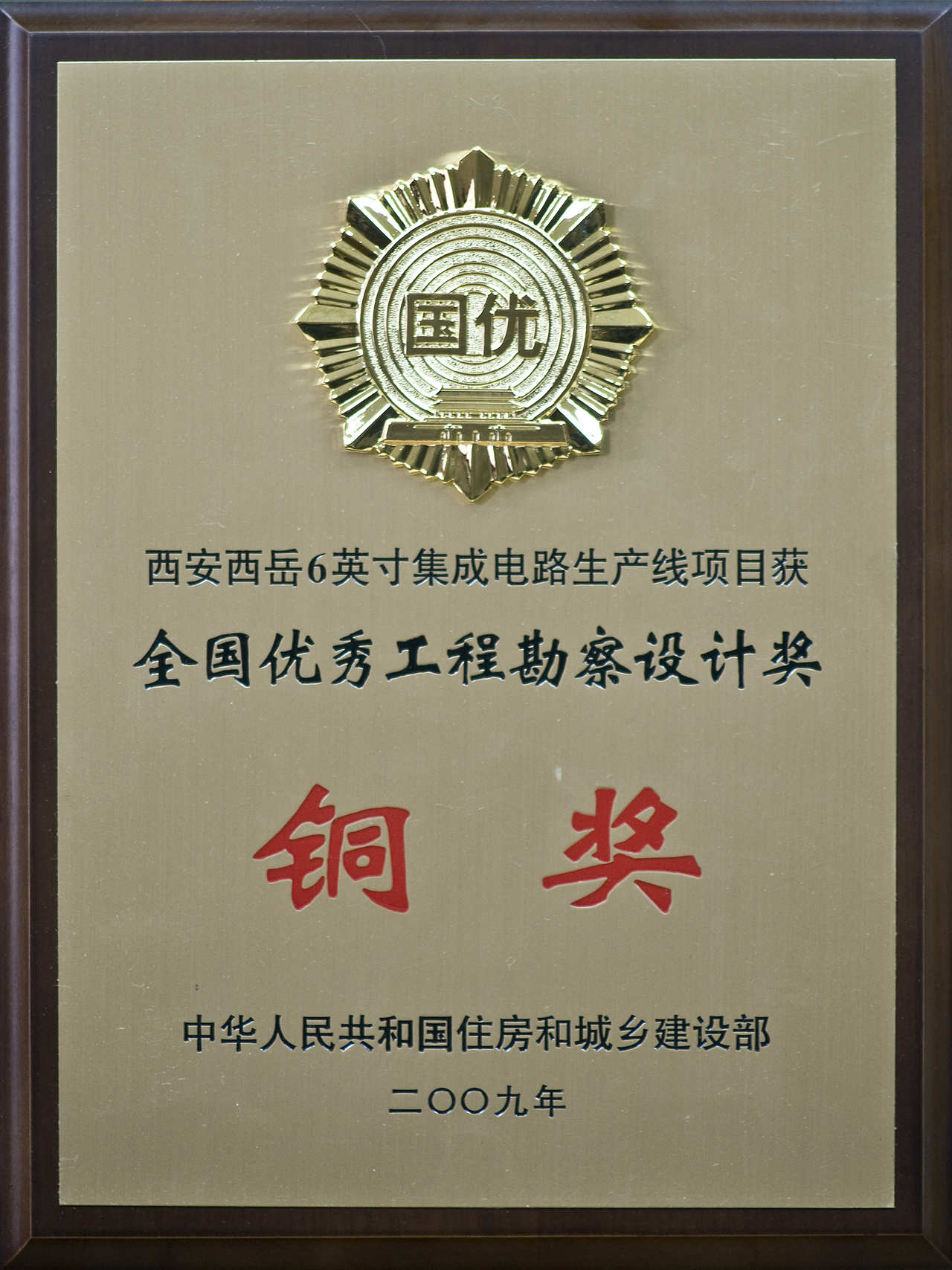 • 2009世源科技西安西岳6英寸集成電路生產線全國優秀工程勘察設計銅獎獎牌-住建部