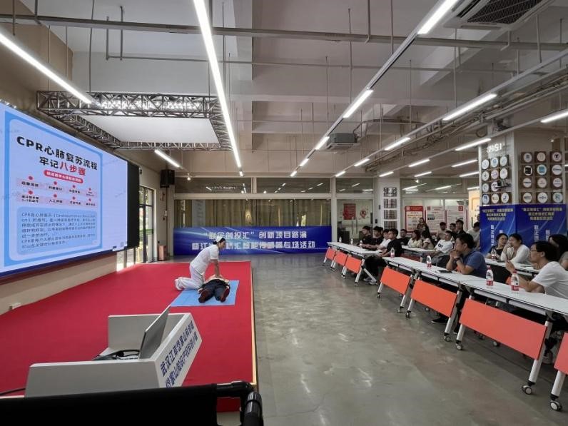 此次專題講座特邀美年大健康專家人員前來授課,授課講師首先結合日常工作場景,為大家細致講解常用急救知識、創傷處理、心肺復蘇以及AED使用方法,現場對心肺復蘇進行模擬教學。